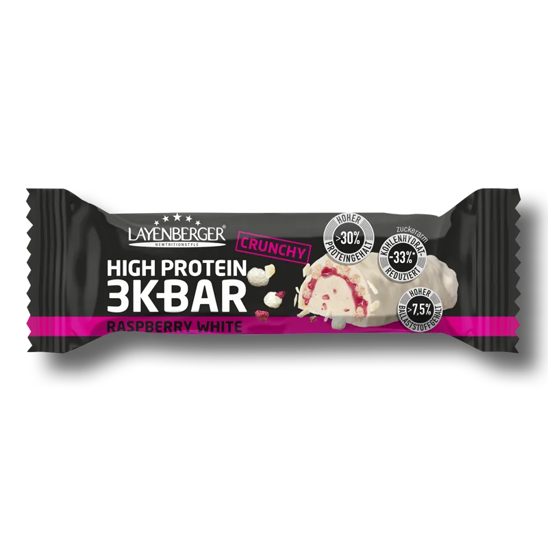 With 14g of protein per bar (30g per 100g), the Layenberger 3K Protein Bar Crunchy Raspberry White offers ideal support for athletes and health-conscious individuals.