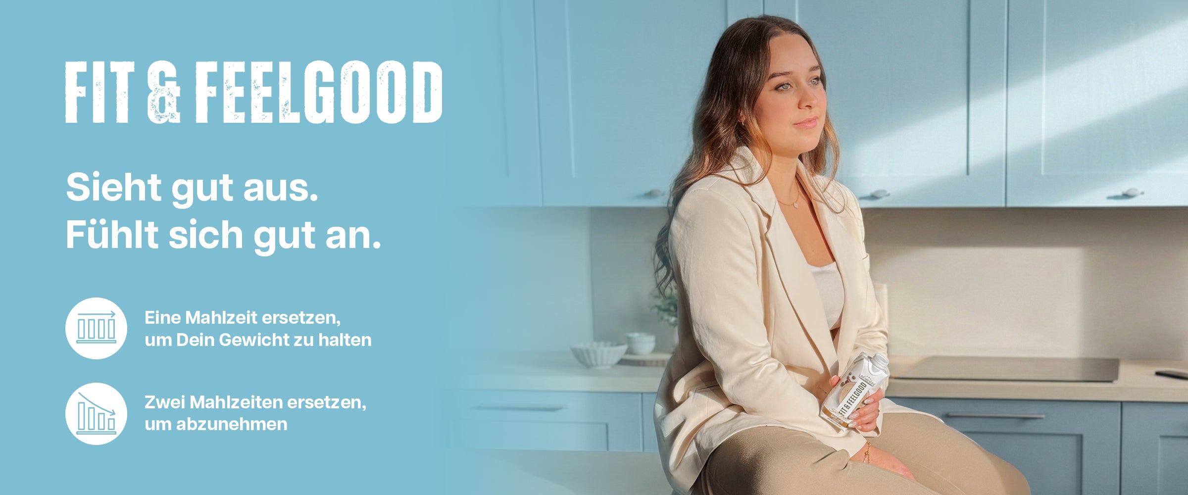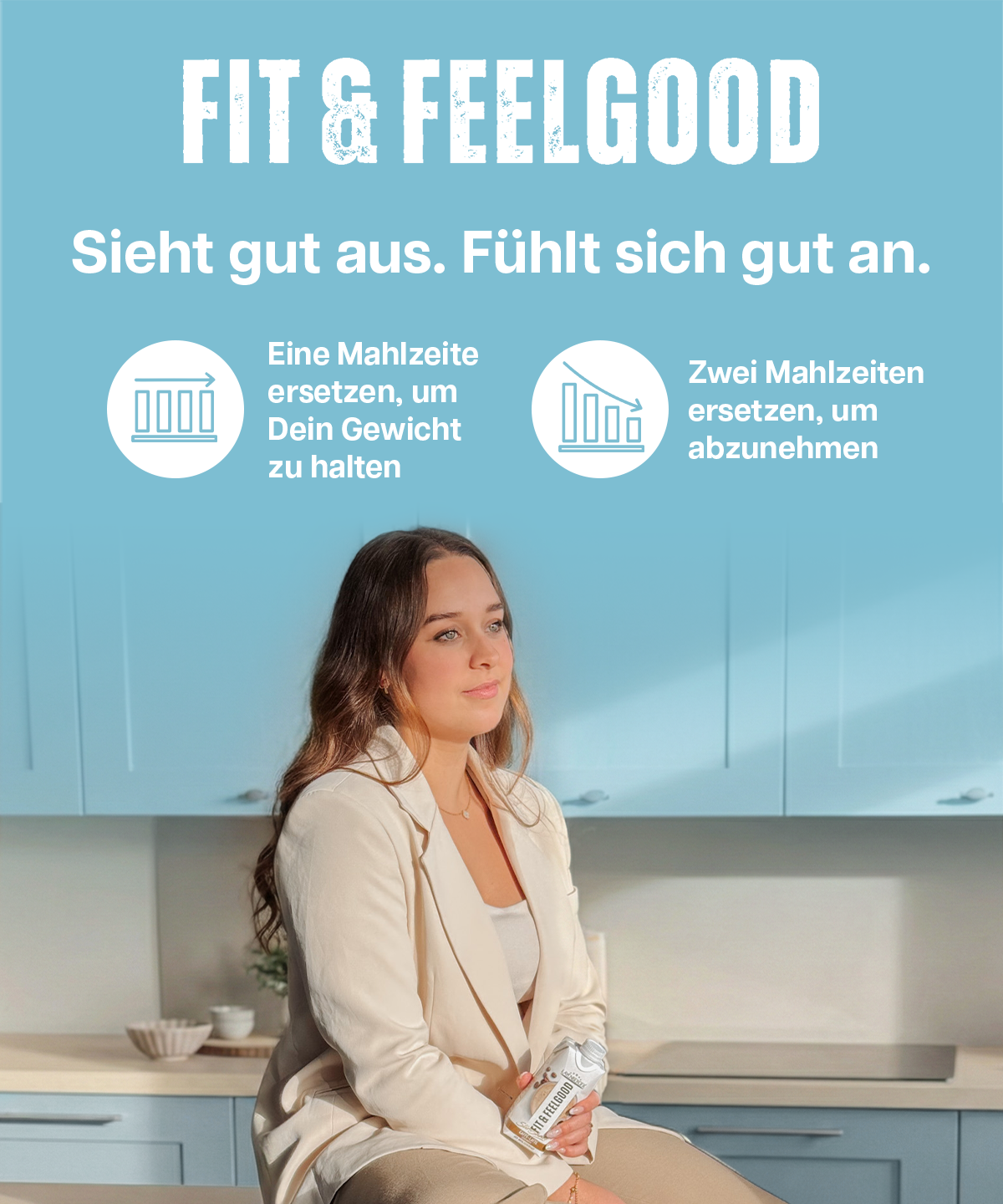 Fit & Feelgood ist kein leerer Trend, sondern ein nach strengen Vorgaben entwickelter Mahlzeitersatz, der sich durch seinen leckeren Geschmack und die Vielzahl an verfügbaren Geschmacksrichtungen deutlich von anderen Produkten auf dem Markt abhebt. Die intelligente, hochwertige Zusammensetzung liefert Dir eine ausgewogene Kombination aus hochwertigem Protein, wertvollen Ballaststoffen und allen essenziellen Vitaminen und Mineralstoffen. Diese umfassende Nährstoffversorgung - exakt nach den strengen Vorgaben der Verordnung (EG) Nr. 432/2012 - macht das Pulver zu einem idealen und sicheren Mahlzeitersatz. So stellst Du sicher, dass Dein Körper optimal versorgt bleibt, während Du effektiv Kalorien einsparst. Verlass Dich auf ein wissenschaftlich geprüftes Konzept, das Dich langanhaltend satt macht.