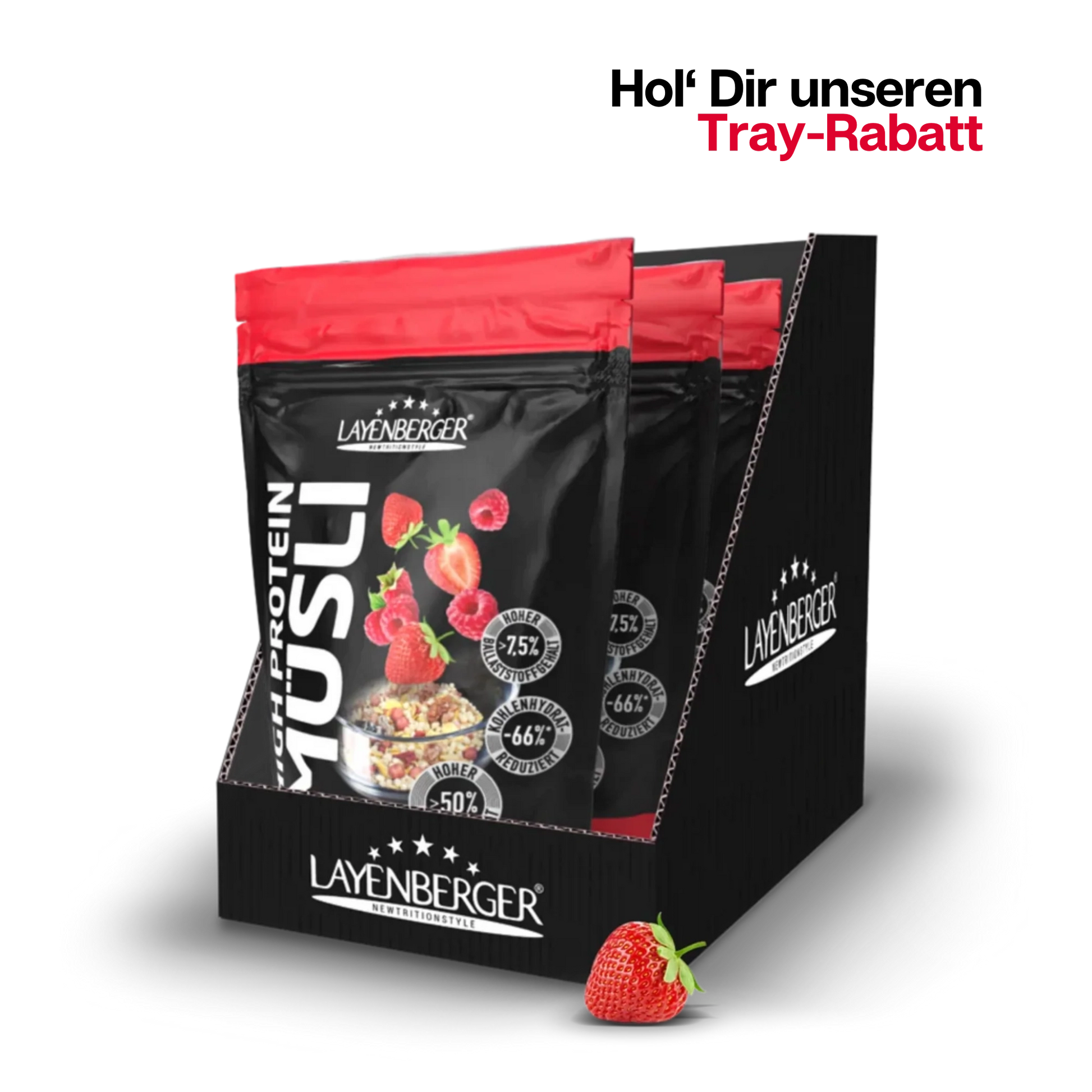 Mit dem 3K Protein Müsli Rote Beeren Mix bekommst du jede Menge Proteine, reduzierte Kohlenhydrate und einen lang anhaltenden Crunch - einfach typisch Layenberger!