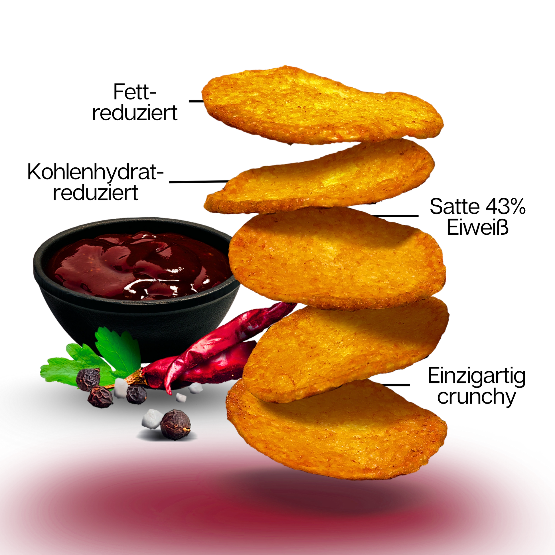 Chips gibt es wie Sand am Meer. Aber unsere Layenberger High Protein Chips BBQ sind die herzhafte Alternative für jeden, der Modern Snacking liebt. Der hohe Proteingehalt kombiniert mit dem köstlich-rauchigen BBQ-Geschmack und dem feinen Crunch beim Zubeißen sind eine perfekte Kombination. Unsere Chips sind nicht frittiert – das reduziert sowohl den Fett- als auch den Acrylamidgehalt. Natürlich haben wir auch die Kohlenhydrate stark reduziert – dafür bürgt der Name Layenberger. Genuss ohne Reue – dafür stehen unsere Layenberger High Protein Chips!