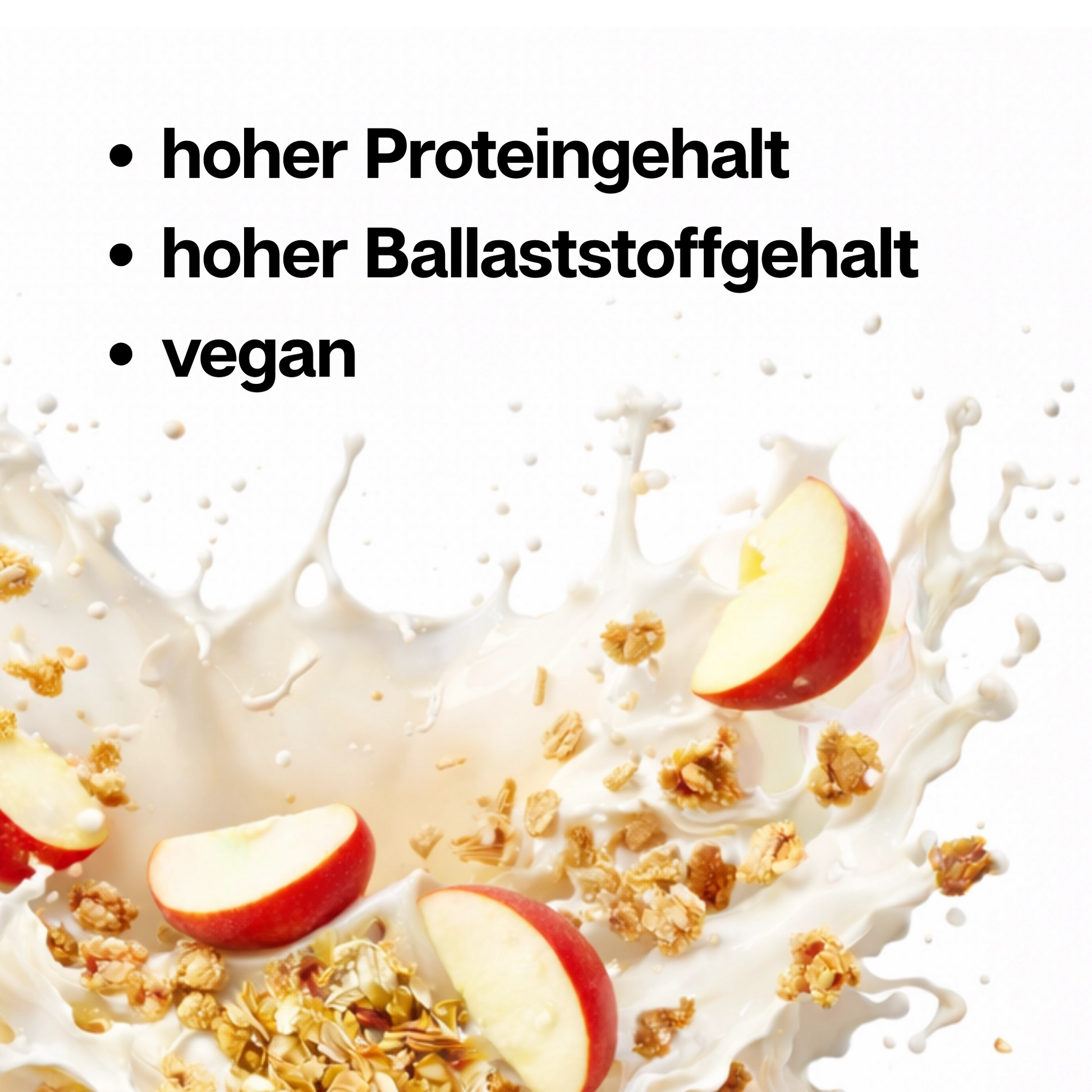 Haferflocken, Sojaflocken 24%, Proteincrispies 10% (Erbsenprotein, Weizenprotein, Maniokstärke), Zucker, Sojaschrot 7,0%, Dinkelweizenflakes (Dinkelweizen, Zucker, Salz, Gerstenmalz), Sonnenblumenöl, Oligofructose, Apfelstücke 3,0%, Apfelsaftkonzentrat 2,6%, Kokosflocken, Apfelflocken 1,7% (Apfel 0,6%, Reismehl, Apfelsaftkonzentrat 0,3%), Kakaogranulat geröstet, Zimt 0,4%, Salz, Aroma (Vanillin).