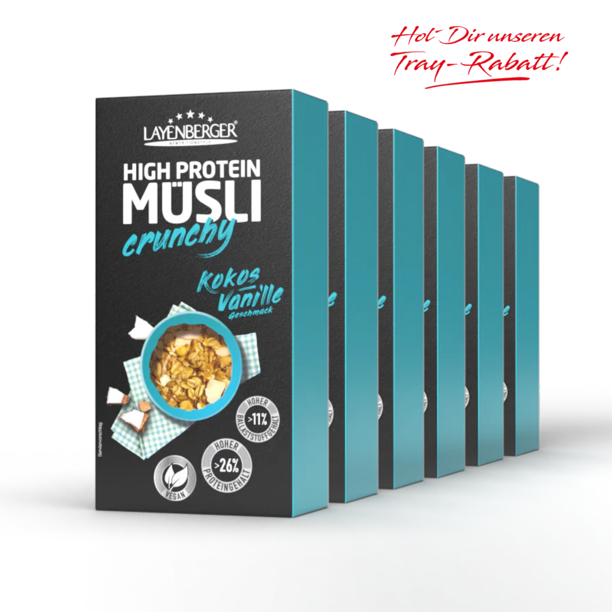 Starte kraftvoll in den Tag mit unserem High Protein Crunchy Müsli Kokos-Vanille. Mit 26% hochwertigem Protein ist es die ideale Wahl für Sportler, Fitness-Fans und alle, die eine bewusste Ernährung schätzen. Dank des hohen Ballaststoffgehalts hält dich unser Müsli lange satt und unterstützt eine gesunde Verdauung.