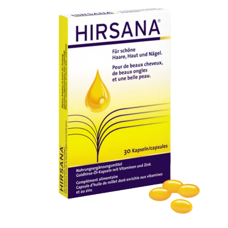 HIRSANA®-Kapseln werden aus hochwertigem Goldhirse-Öl hergestellt, das durch ein besonders schonendes Verfahren direkt aus dem Korn gewonnen wird. Jede Kapsel enthält die geballte Nährstoffkraft von 4 kg Goldhirse. Diese Schweizer Entwicklung hat sich bereits als bewährte Unterstützung für die Regeneration von Haut, Haaren und Nägeln etabliert und ist nun auch in Ihrer Apotheke erhältlich.