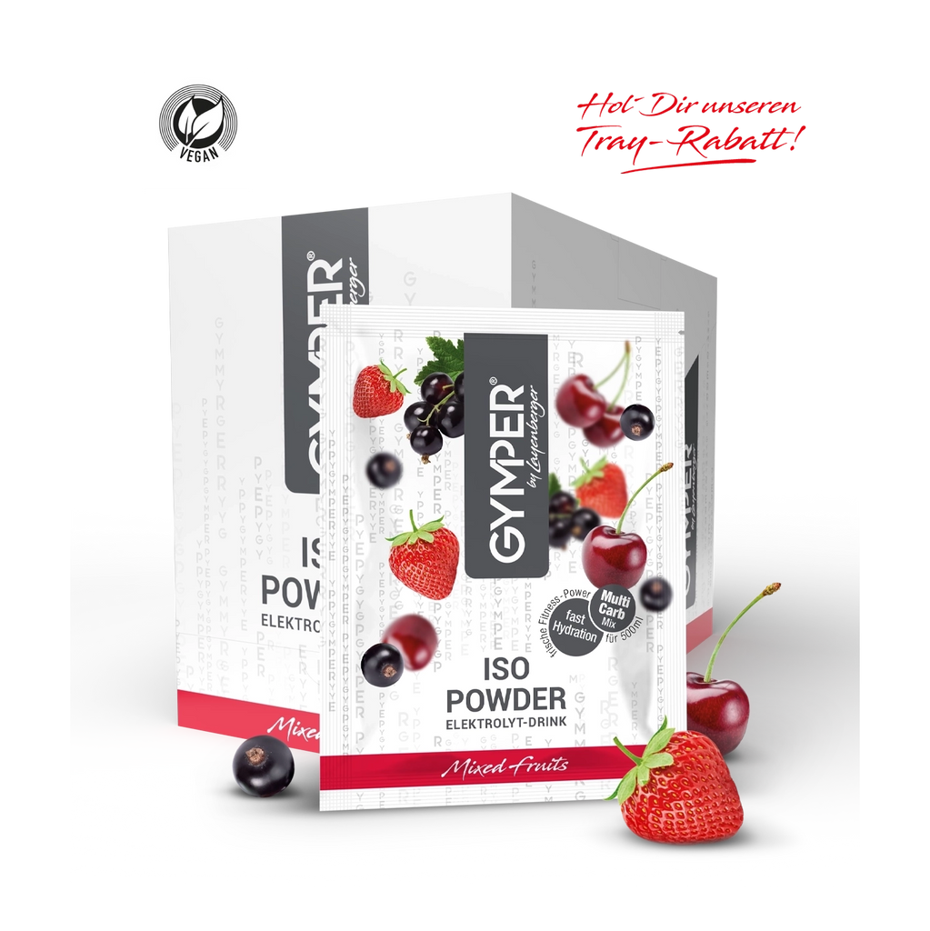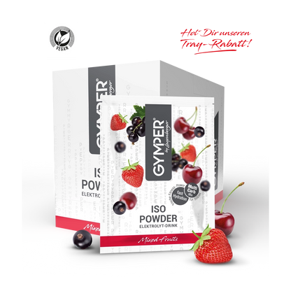 Beim Sport braucht Dein Körper Kohlenhydrate und Mineralstoffe. Und er braucht sie schnell. Isotonie heißt das Zauberwort dafür – das Mischungsverhältnis von Elektrolyten (Carbs und Mineralstoffe) zur Flüssigkeit muss dem des menschlichen Blutes entsprechen. Das GYMPER Iso Powder Mixed Fruits schafft diesen Zaubertrick ganz locker – abracadabra! So kann Dein Organismus alle Inhaltstoffe schnell verarbeiten und Dir Flüssigkeit zur Verfügung stellen, um den Verlust durchs Schwitzen auszugleichen.