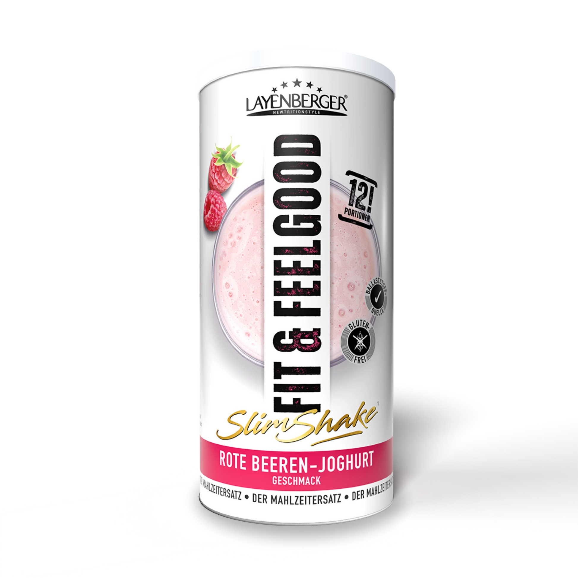 Mahlzeitersatz für eine gewichtskontrollierende Ernährung mit Rote Berren-Joghurt-Geschmack und mit Süßungsmitteln.