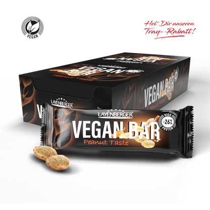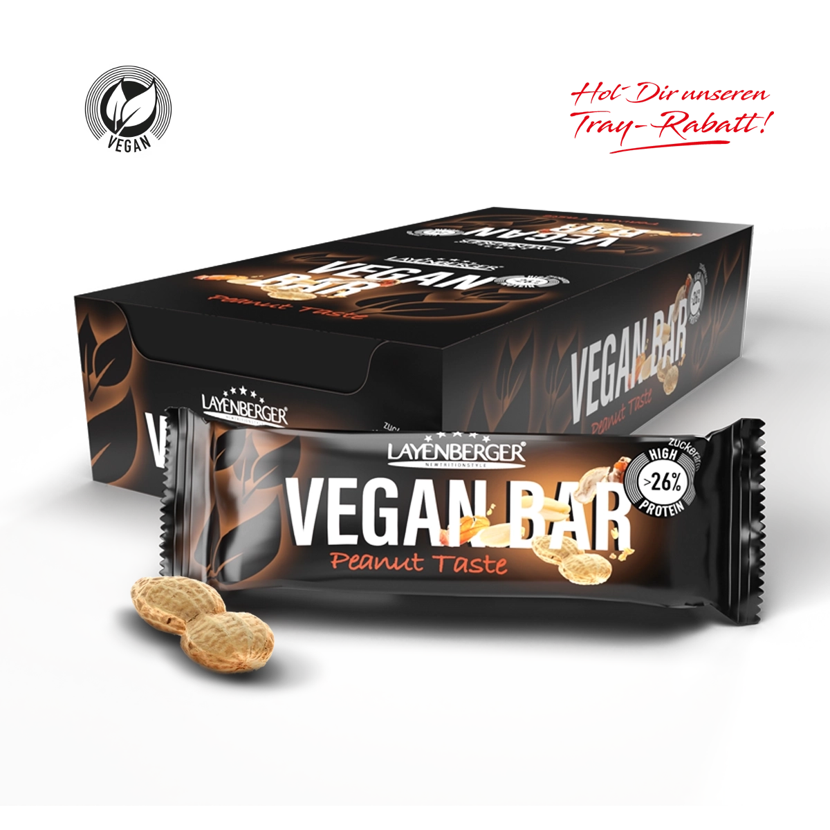 Der Vegan Bar Erdnuss überzeugt durch den crunchy Proteinkern mit eingebetteten Sojacrispies und feinem Erdnussgeschmack. Darüber liegt eine weitere Schicht mit herb-süßem Karamell-Geschmack. Abgerundet und getoppt wird diese grandiose Komposition durch einen Überzug aus zartschmelzender Schokolade mit gerösteten Erdnussstückchen.